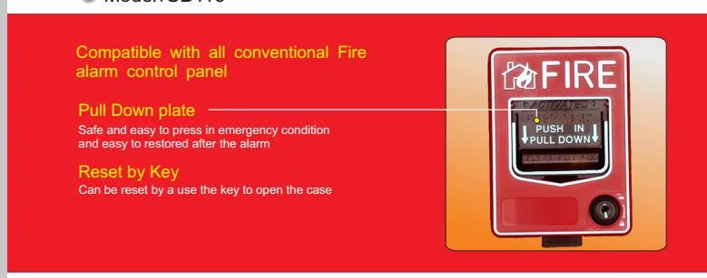 Manual Call Point, Designed for Fire Alarm Systems and Security Alarm system.Key Specifications/Special FeaturesAvailable for flush or surface mountingPlastic film on glassTest key inserted from sideOpen circuit with series resistorSuitable for the majority of conventional fire alarm systems